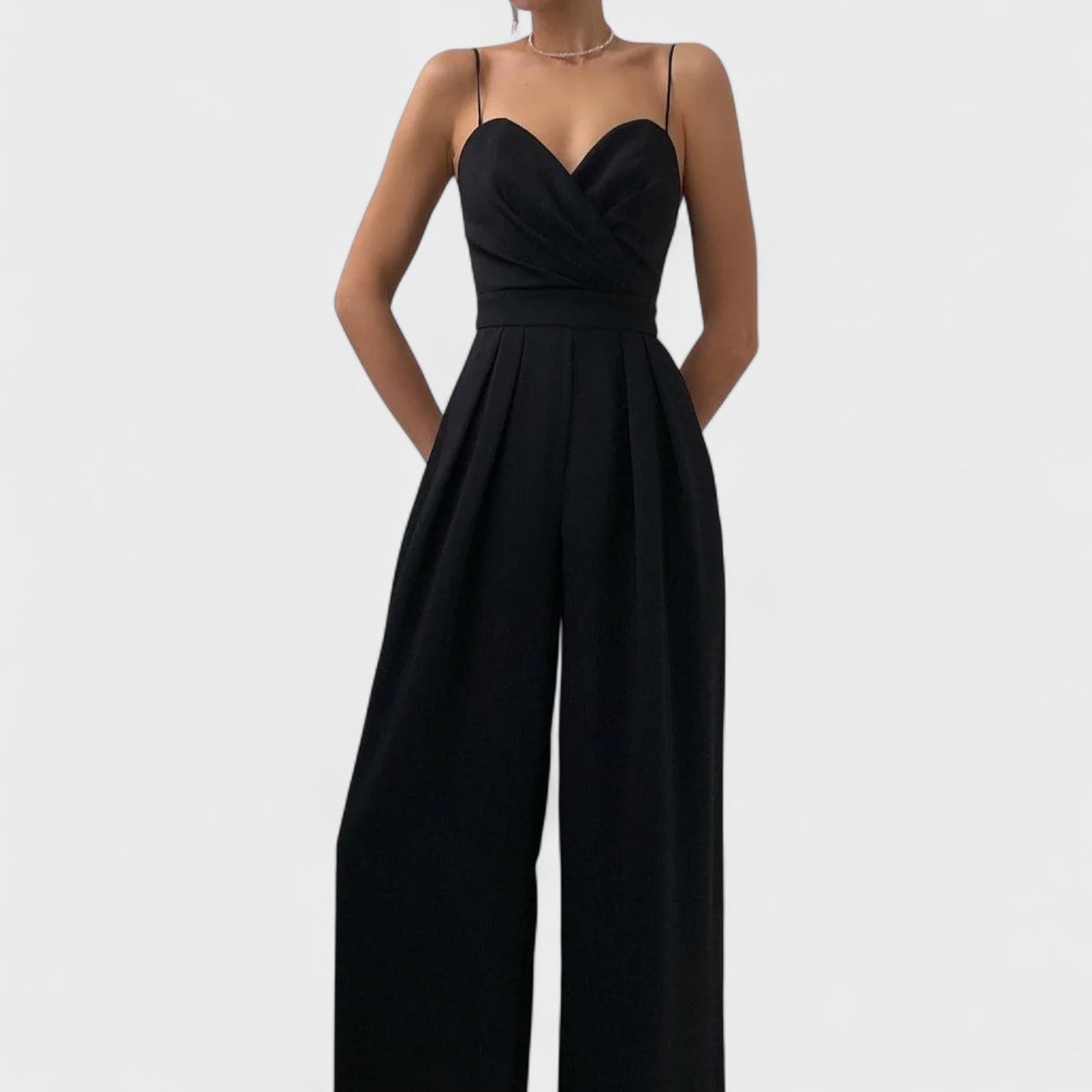 Tento dlhý overal s tenkými ramienkami a krížovým výstrihom je ideálnou voľbou pre tých, ktorí hľadajú rafinovanosť s moderným akcentom. Zvýraznený pás podčiarkuje siluetu a pridáva prirodzenú eleganciu pri každej príležitosti – od formálnych večerí po oslavy. Jeho minimalistický dizajn robí z neho univerzálny kus šatníka, ktorý sa dá ľahko doplniť výraznými alebo tlmenými doplnkami, v závislosti od vášho štýlu.