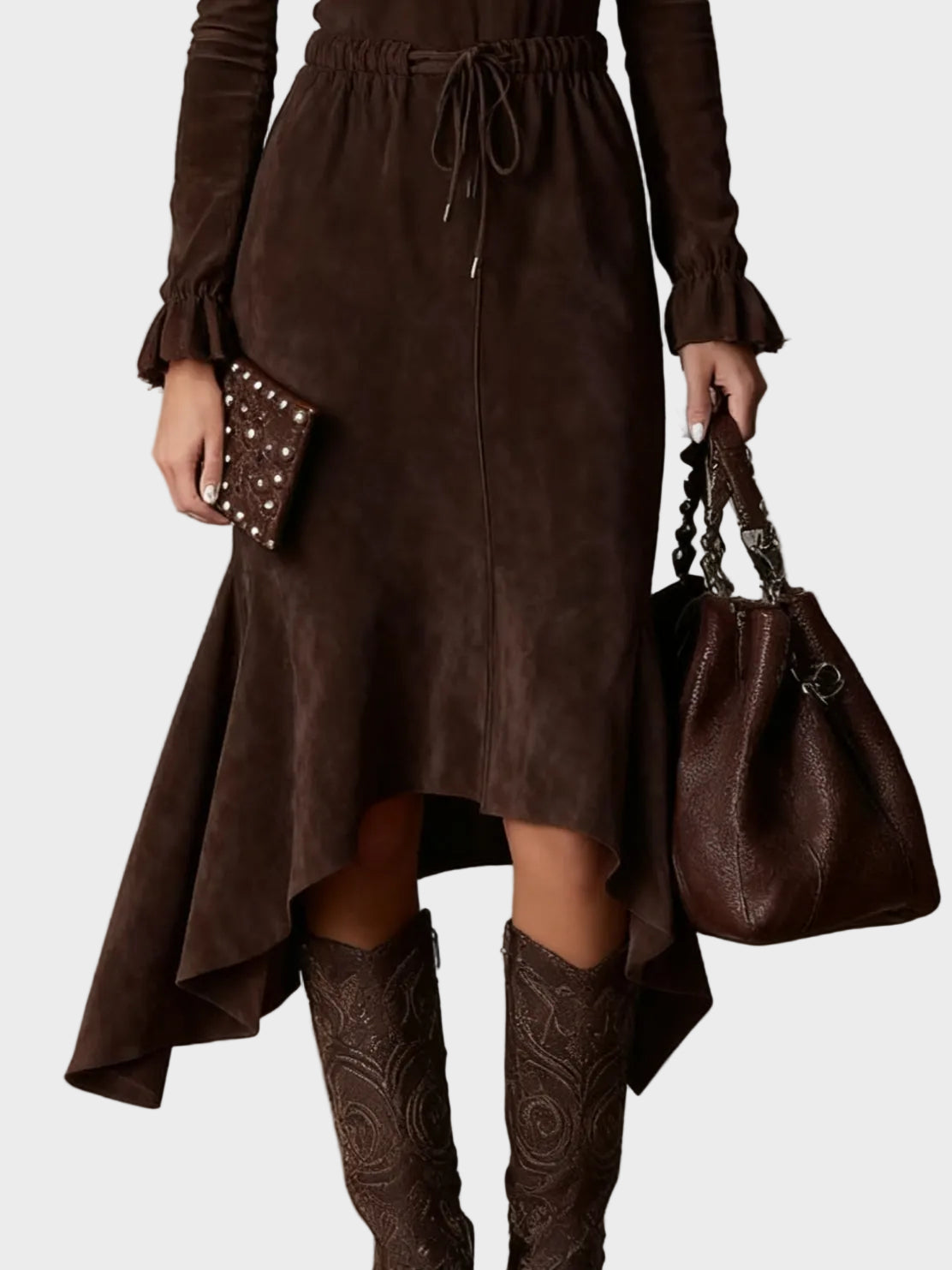 Elegantná Midi Šaty z Semišu v Tmavej Hnedej s Viazaním