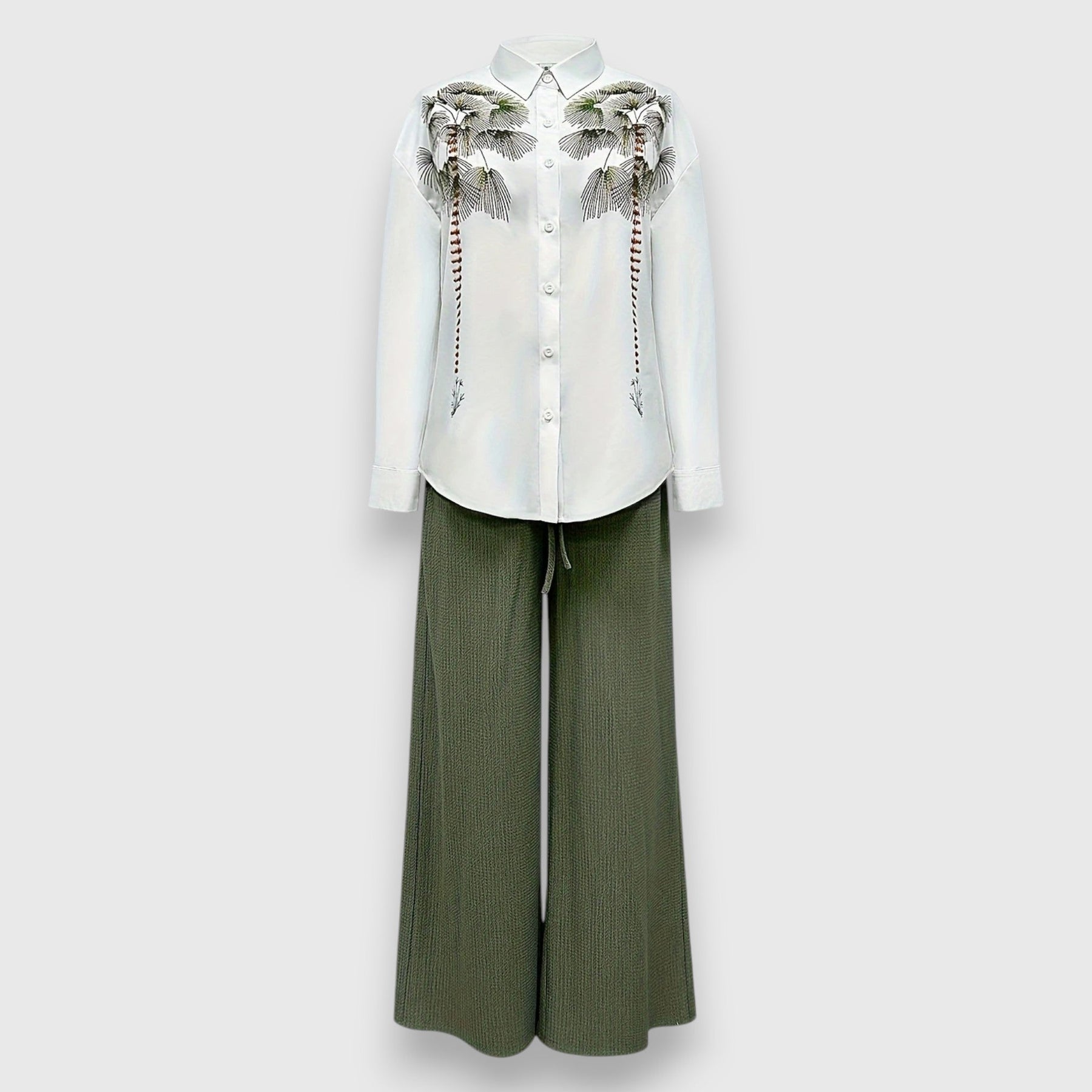 Súprava spája elegantnú blúzku s jemným kvetinovým vzorom a voľné nohavice so širokými nohavicami – ideálne na štýlové dni. Ľahký materiál a vysoký golier dodávajú súprave ženský a sofistikovaný charakter.
