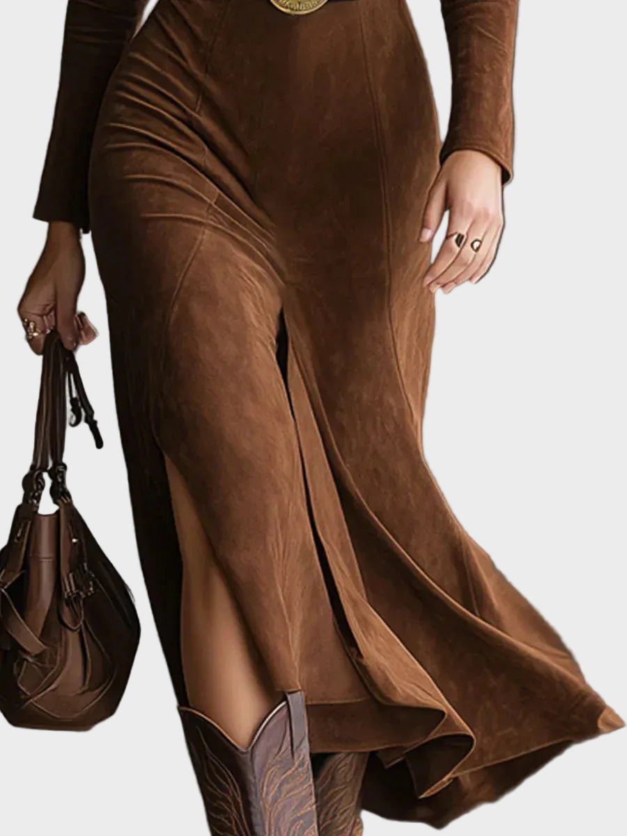 Retro západný štýl goliera z faux zamšu, midi s rozparkom